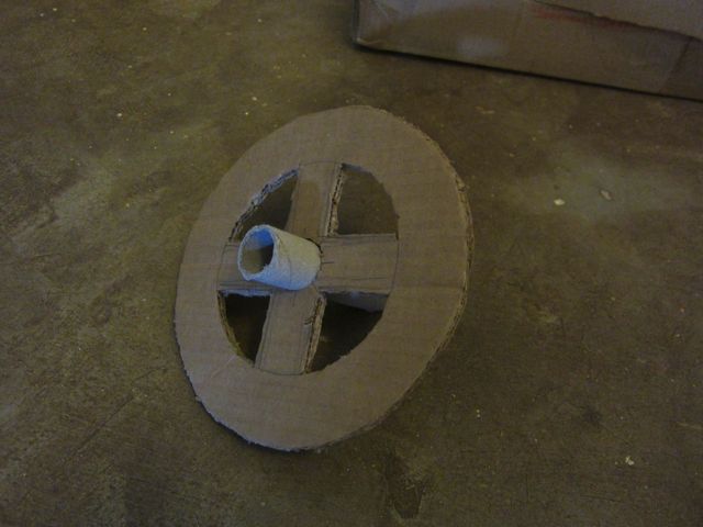 I cut out the wheel from a piece of cardboard. For the outer circle I traced a bowl and then marked the center by measuring across from several different points. The rest just required a little measuring. I can't recall where the pole piece came from, but it is a sturdy cardboard roll much like the aluminum foil rolls used in the basic structure of the truck. The hole in the center of the wheel was measured to fit the pole.